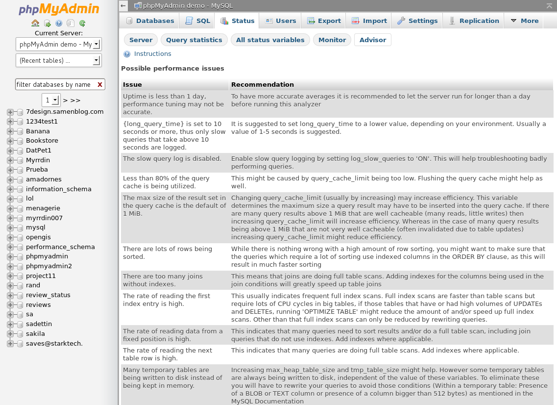 The best way to see phpMyAdmin in action is to try it on our demo server, where you have full control over MySQL.