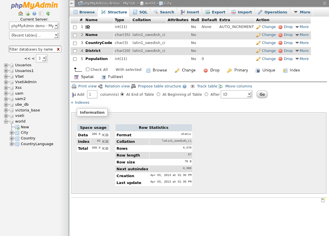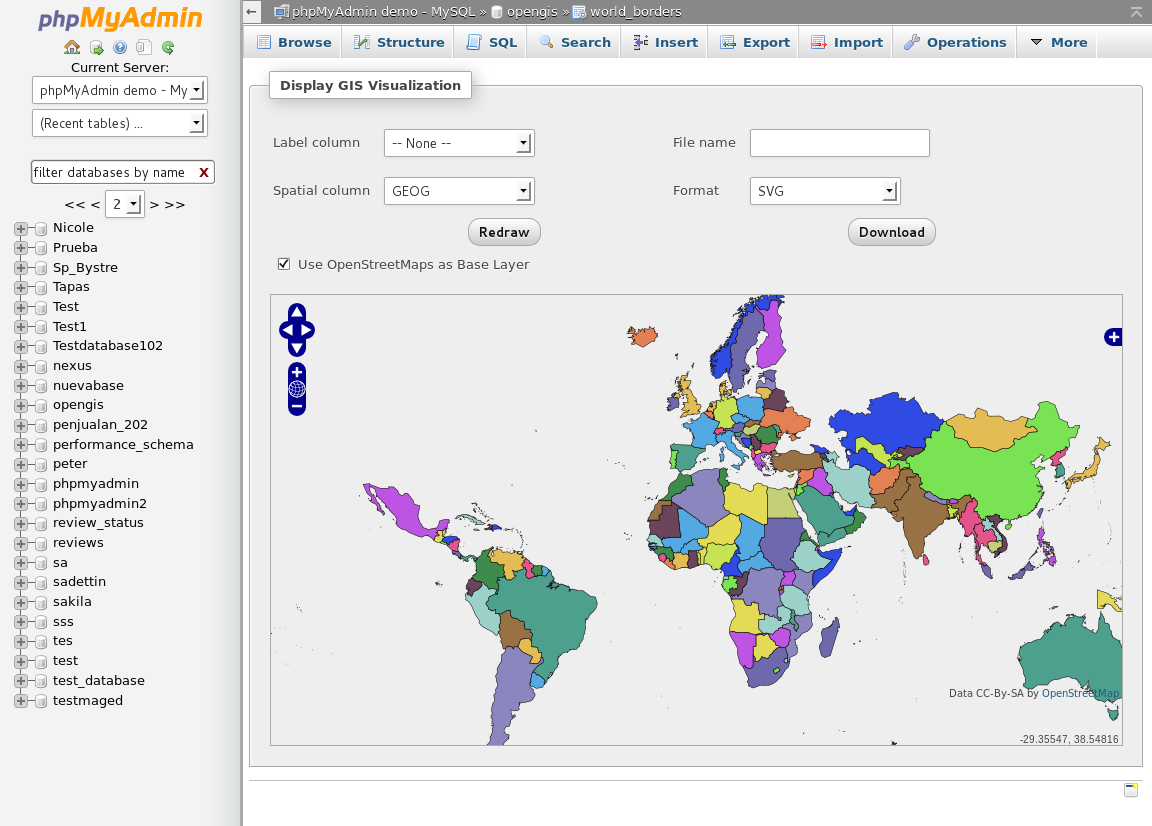 The demo is running on MySQL and MariaDB. phpMyAdmin has enabled additional relational features and MIME transformations.