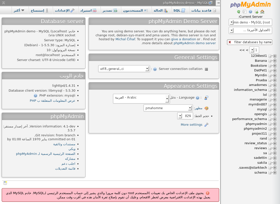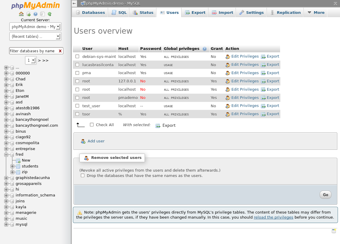Please do not change the root, debian-sys-maint, or pma user passwords or limit their permissions. If you do so, the demo cannot be accessed until privileges are restored, which disrupts access for yourself and other users. Feel free to explore any of the phpMyAdmin features. If you break something, just wait a while. The database configuration resets every hour. Databases are cleaned weekly, so do not expect that your data will stay there forever.